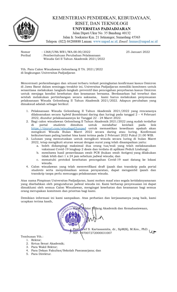 Pengumuman Pemberitahuan Perubahan Pelaksanaan Wisuda Gel II Tahun Akademik 2021/2022 Kantor Komunikasi Publik 2022-01-28 1 min read 2022-01-28 Share this: Baca 1 menit 901 views Share this: