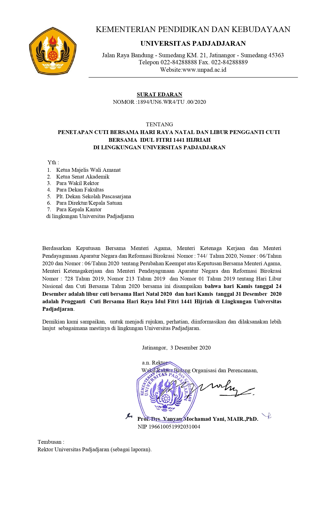 Pengumuman Penetapan Cuti Bersama Hari Raya Natal dan Libur Pengganti Cuti Bersama Idulfitri 1441 H di Lingkungan Unpad Kantor Komunikasi Publik 2020-12-03 1 min read 2020-12-03 Share this: Baca 1 menit 920 views Share this: