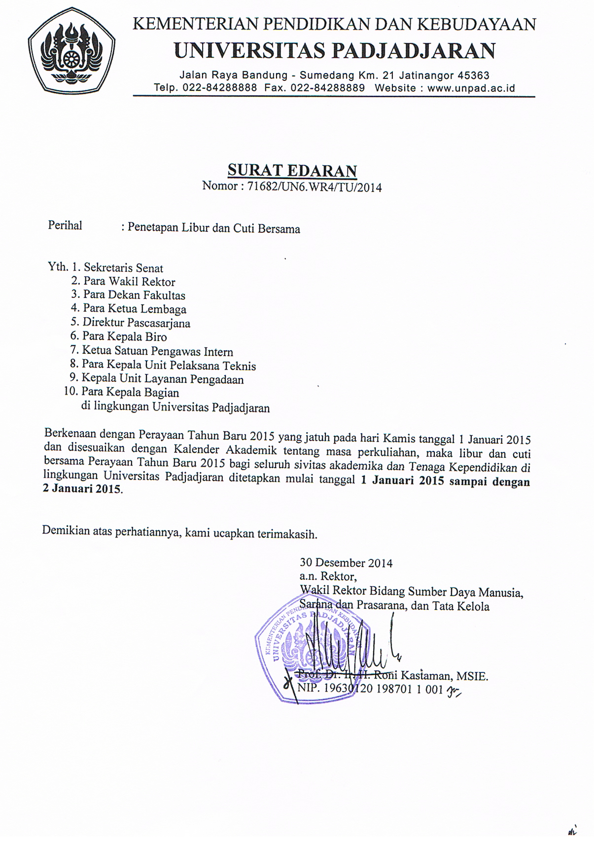 Pengumuman Penetapan Libur dan Cuti Bersama 1-2 Januari 2015 Kantor Komunikasi Publik 2014-12-30 1 min read 2014-12-30 Share this: Baca 1 menit 450 views Share this: