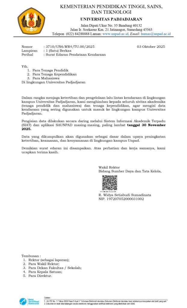 Pengumuman Pengisian Data Kendaraan Dosen, Tenaga Kependidikan dan Mahasiswa Erman 2025-10-07 1 min read 2025-10-07 Share this: Baca 1 menit Panduan Registrasi Kendaraan dapat dibaca di sini. 2357 views Share this: