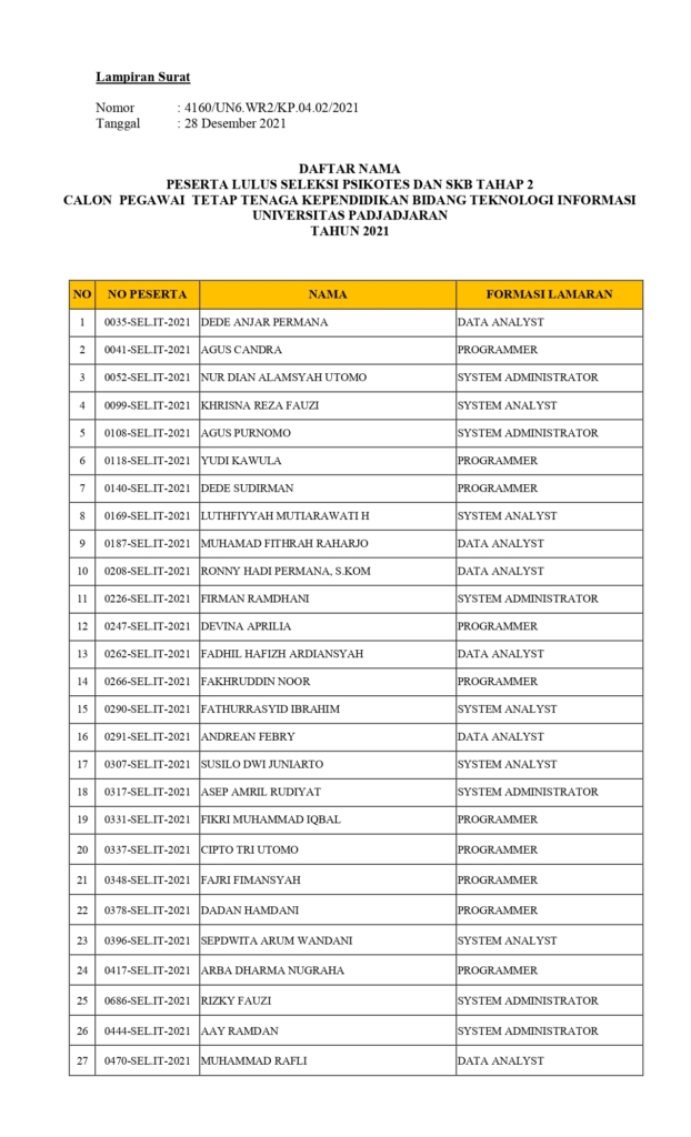 Pengumuman Pengumuman Hasil Psikotes dan SKB Tahap 2 Seleksi Calon Pegawai Tetap Unpad Tahun 2021 Kantor Komunikasi Publik 2021-12-28 1 min read 2021-12-28 Share this: Baca 1 menit 1210 views Share this: