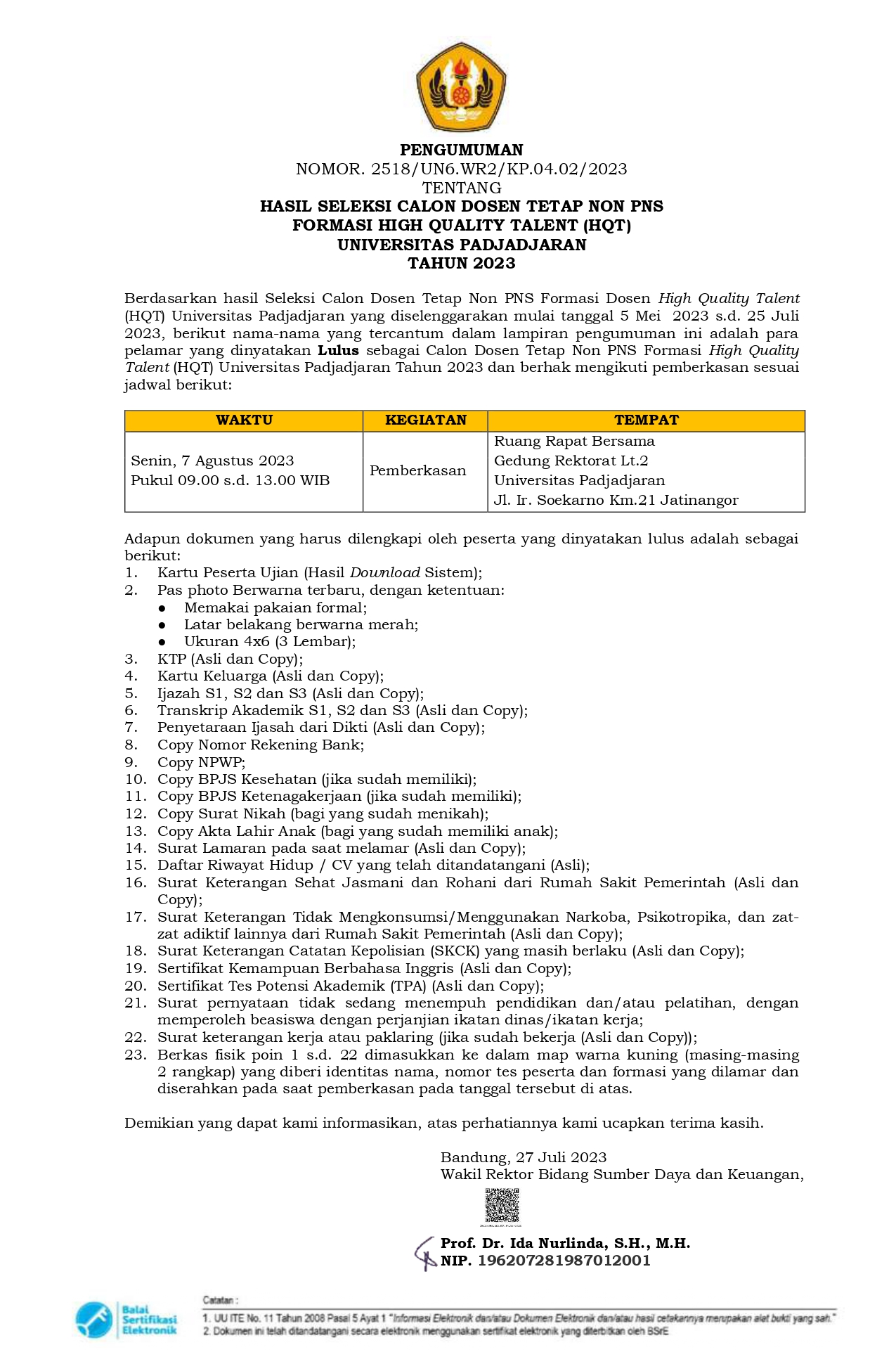 Pengumuman Pengumuman Hasil Seleksi Calon Dosen Tetap Non-PNS Formasi High Quality Talent Unpad 2023 Kantor Komunikasi Publik 2023-07-27 1 min read 2023-07-27 Share this: Baca 1 menit 1164 views Share this:
