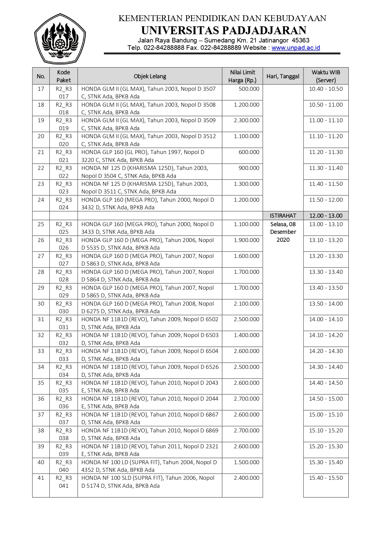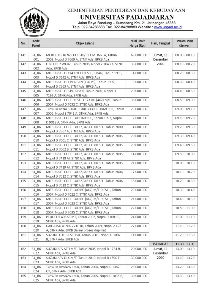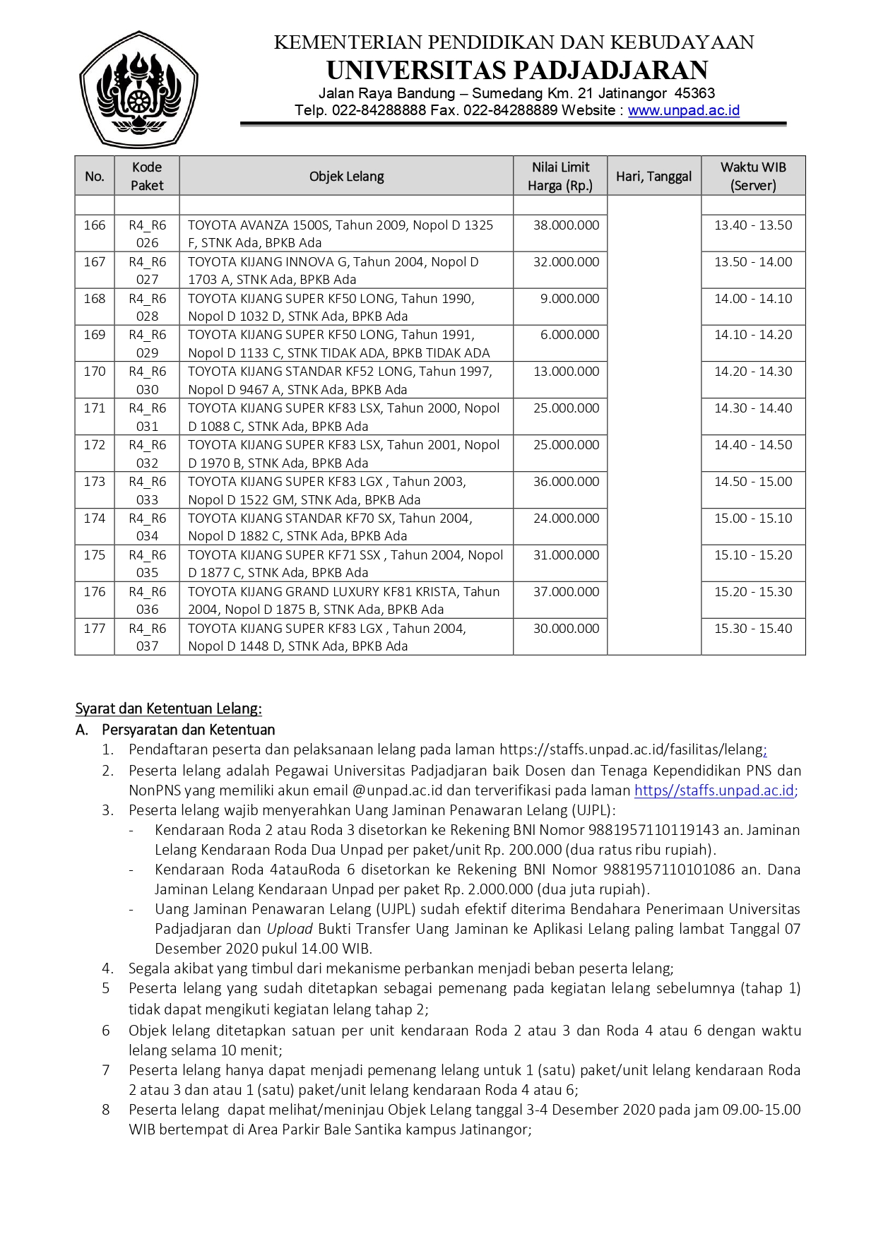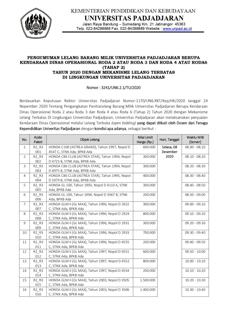 Pengumuman Pengumuman Lelang Barang Milik Universitas Padjadjaran Berupa Kendaraan Dinas Operasional Roda 2 Atau Roda 3 dan Roda 4 Atau Roda 6 Kantor Komunikasi Publik 2020-12-02 1 min read 2020-12-02 Share this: Baca 1 menit 1294 views Share this: