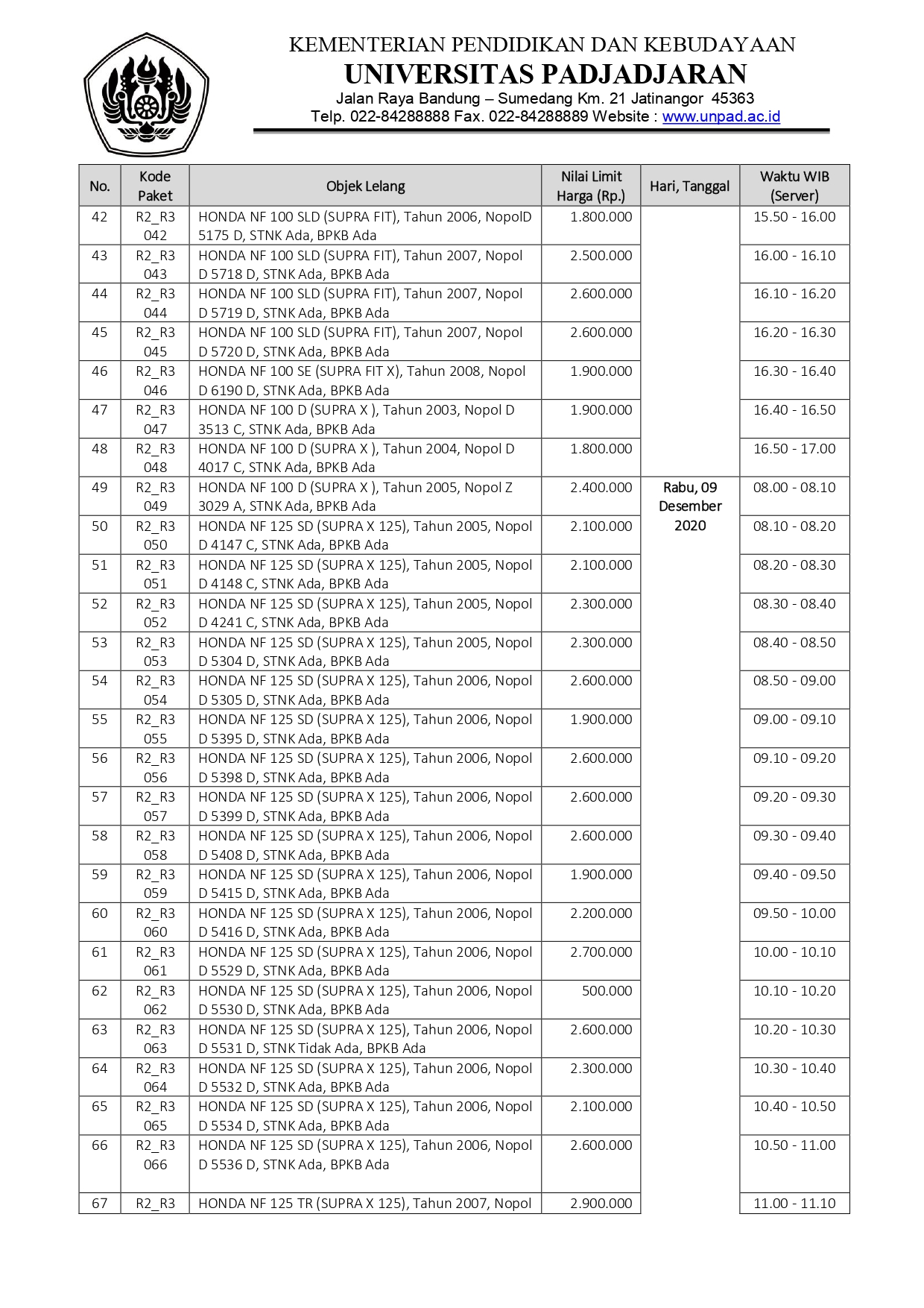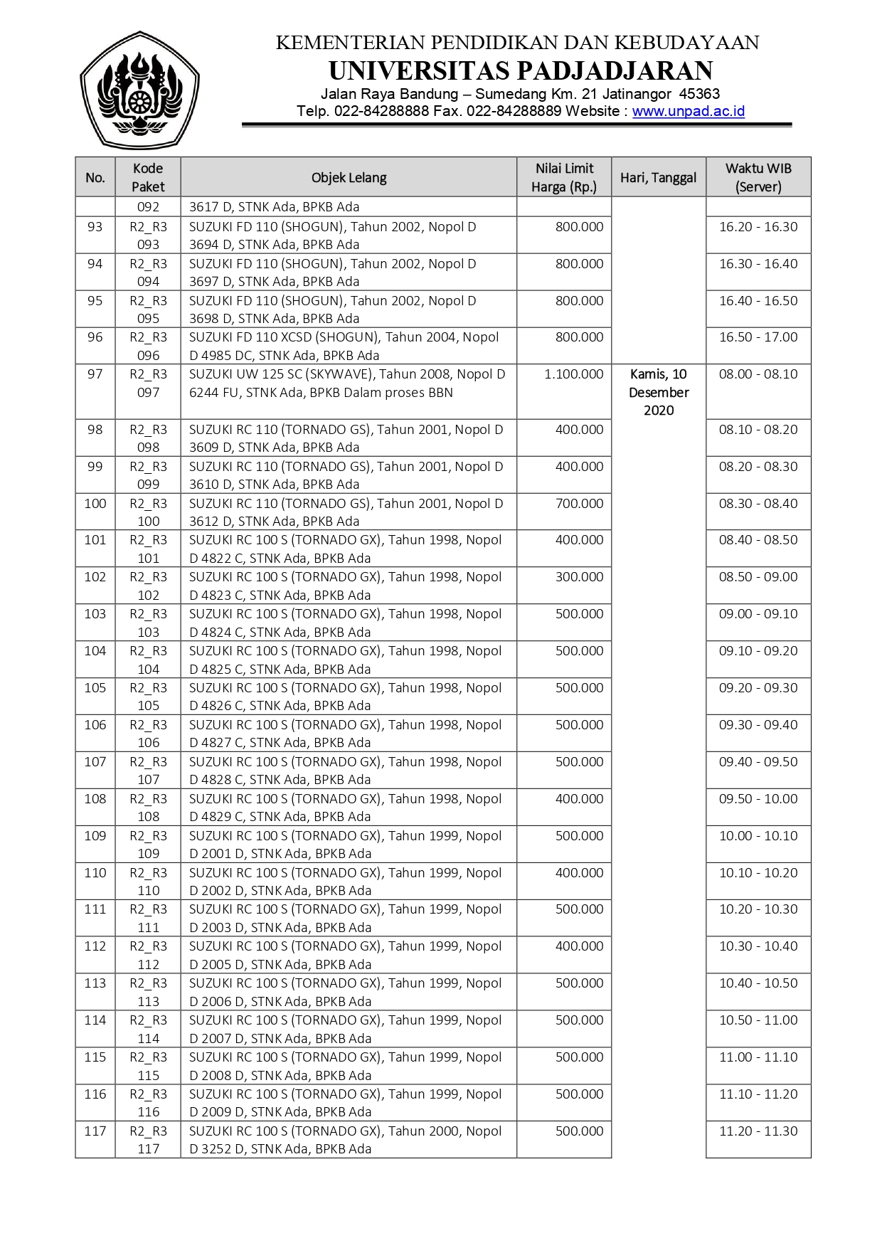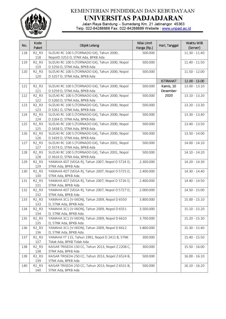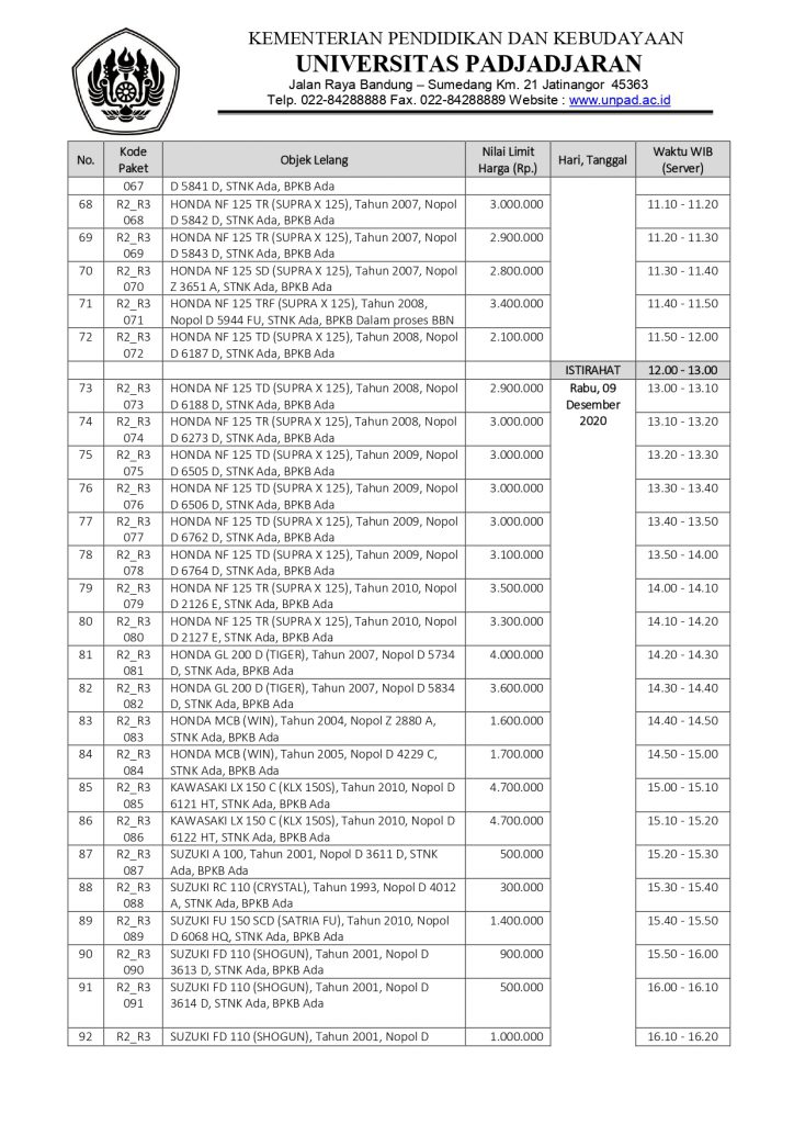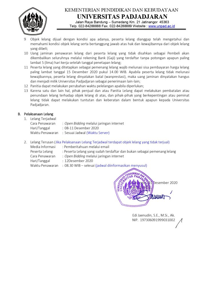 Pengumuman Pengumuman Lelang Barang Milik Universitas Padjadjaran Berupa Kendaraan Dinas Operasional Roda 2 Atau Roda 3 dan Roda 4 Atau Roda 6 Kantor Komunikasi Publik 2020-12-02 1 min read 2020-12-02 Share this: Baca 1 menit 1294 views Share this:
