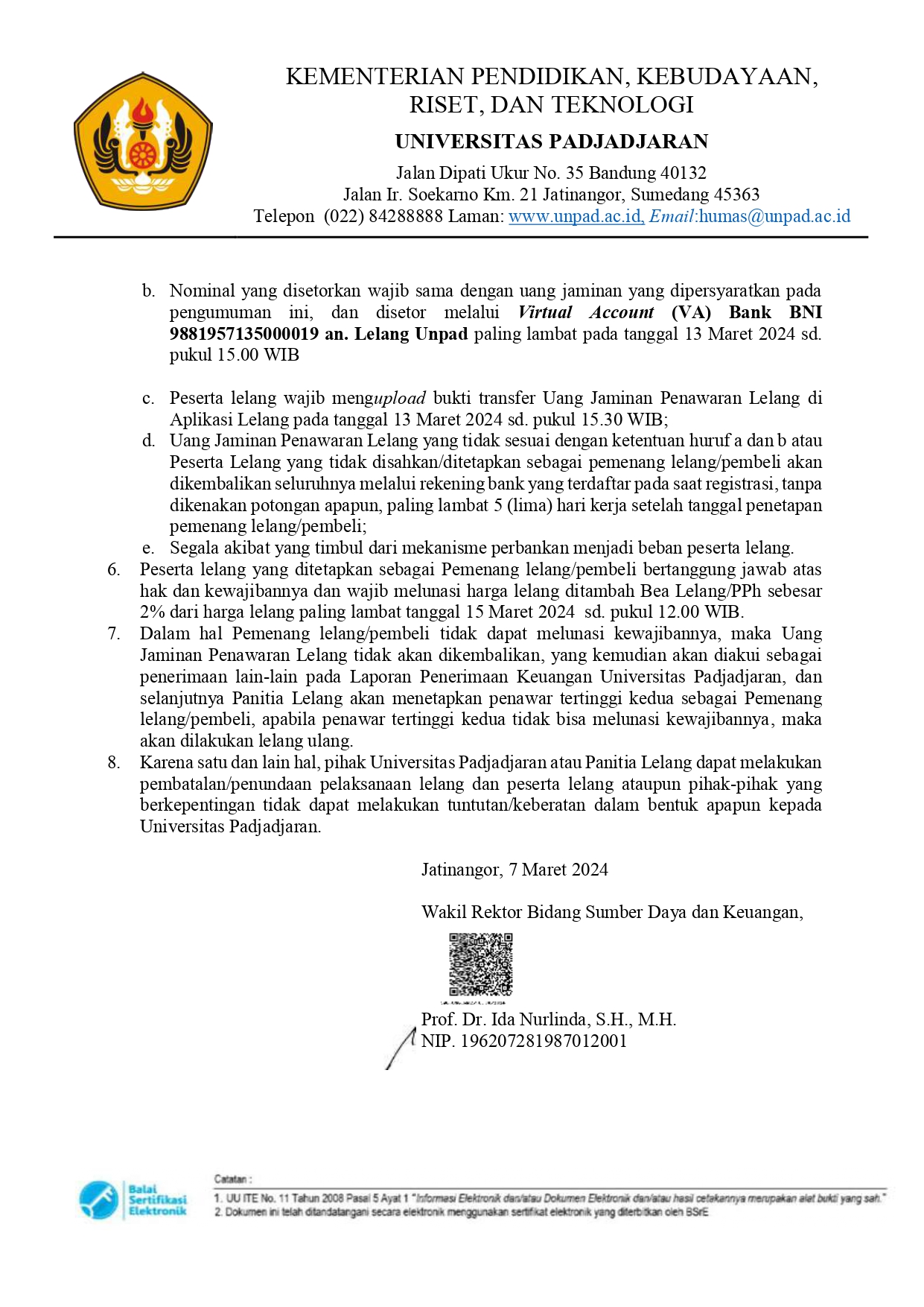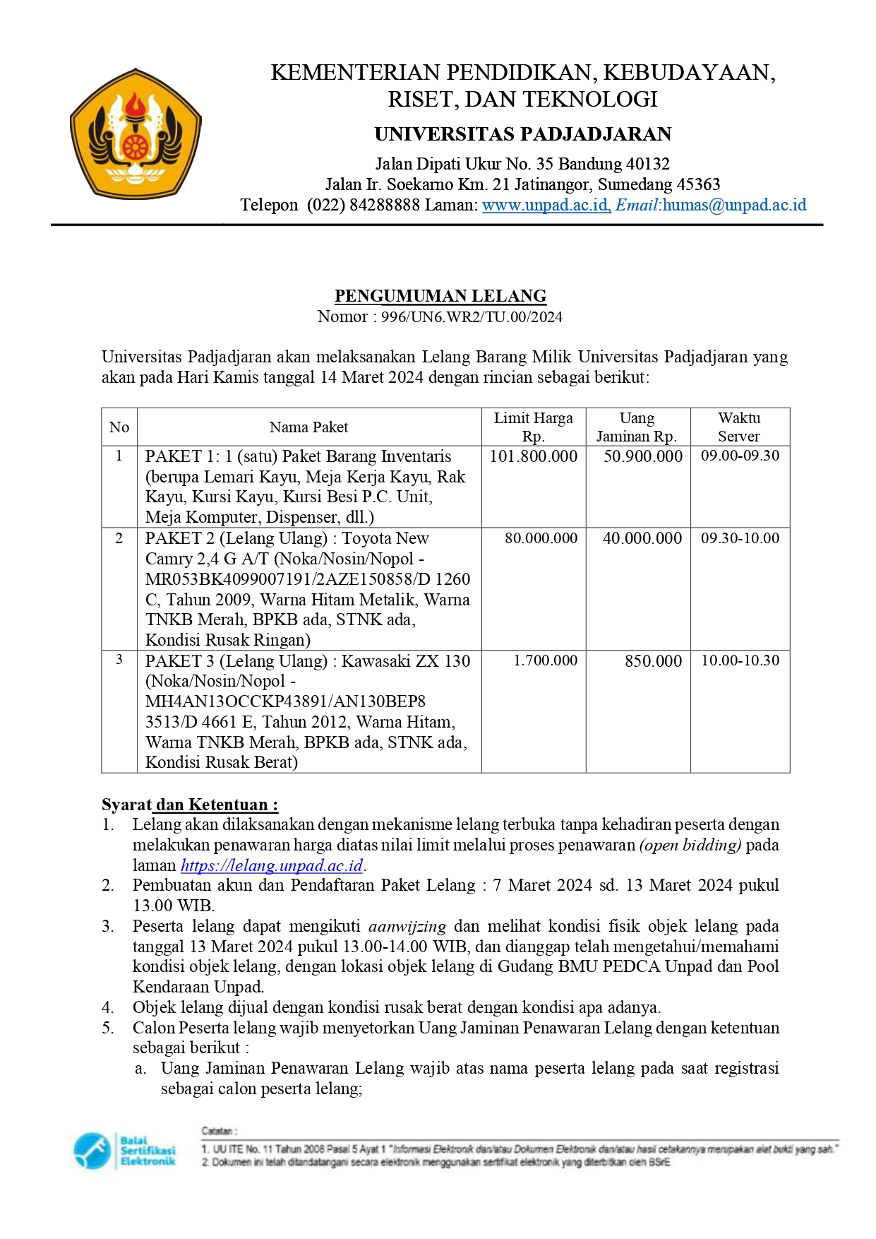 Pengumuman Pengumuman Lelang Barang Milik Unpad Kantor Komunikasi Publik 2024-03-08 1 min read 2024-03-08 Share this: Baca 1 menit 7102 views Share this: