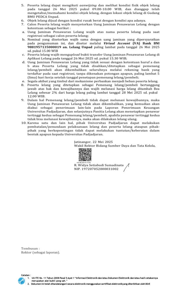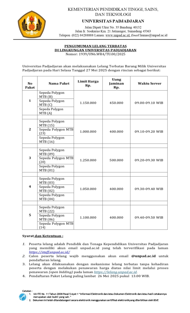 Pengumuman Pengumuman Lelang Terbatas di Lingkungan Universitas Padjadjaran – Sepeda Polygon MTB Erman 2025-05-22 1 min read 2025-05-22 Share this: Baca 1 menit 2610 views Share this:
