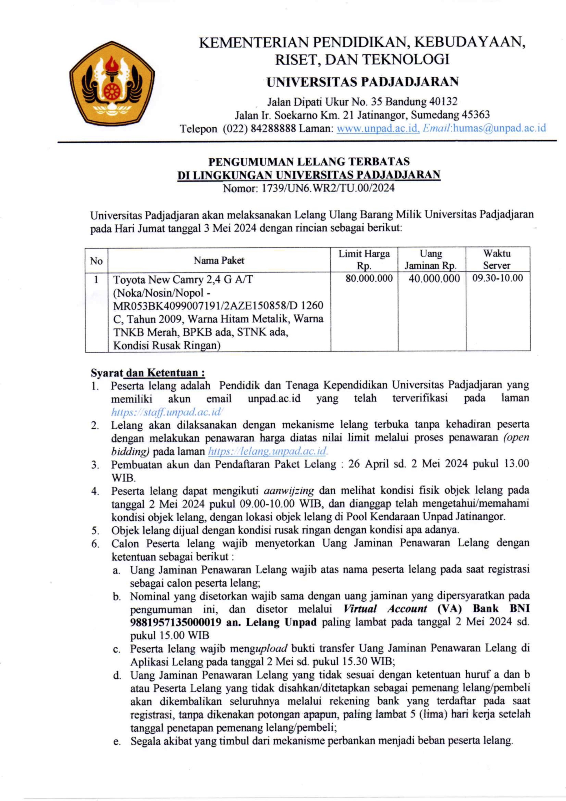 Pengumuman Pengumuman Lelang Terbatas di Lingkungan Unpad Kantor Komunikasi Publik 2024-04-26 1 min read 2024-04-26 Share this: Baca 1 menit 7650 views Share this: