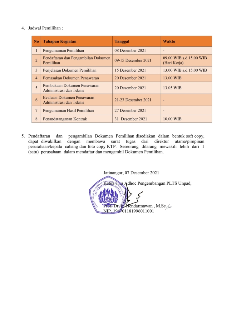 Pengumuman Pengumuman Pemilihan Mitra Kerja Sama Pengembangan PLTS di Unpad Kantor Komunikasi Publik 2021-12-07 1 min read 2021-12-07 Share this: Baca 1 menit 899 views Share this: