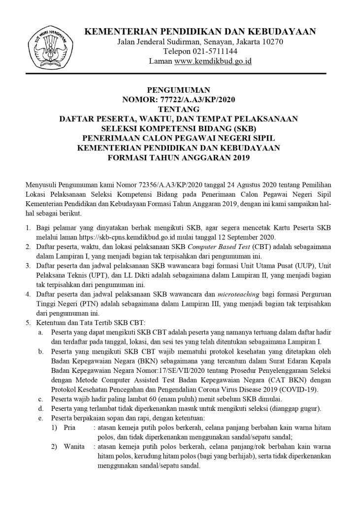 Pengumuman Pengumuman Daftar Peserta, Waktu, dan Tempat Pelaksanaan Seleksi Kompetensi Bidang (SKB) Penerimaan CPNS Kemendikbud Formasi TA 2019 Kantor Komunikasi Publik 2020-09-16 1 min read 2020-09-16 Share this: Baca 1 menit Gambaran Umum Tes Wawancara dan Tes Praktik Mengajar Aplikasi SKB Kemendikbud 860 views Share this: