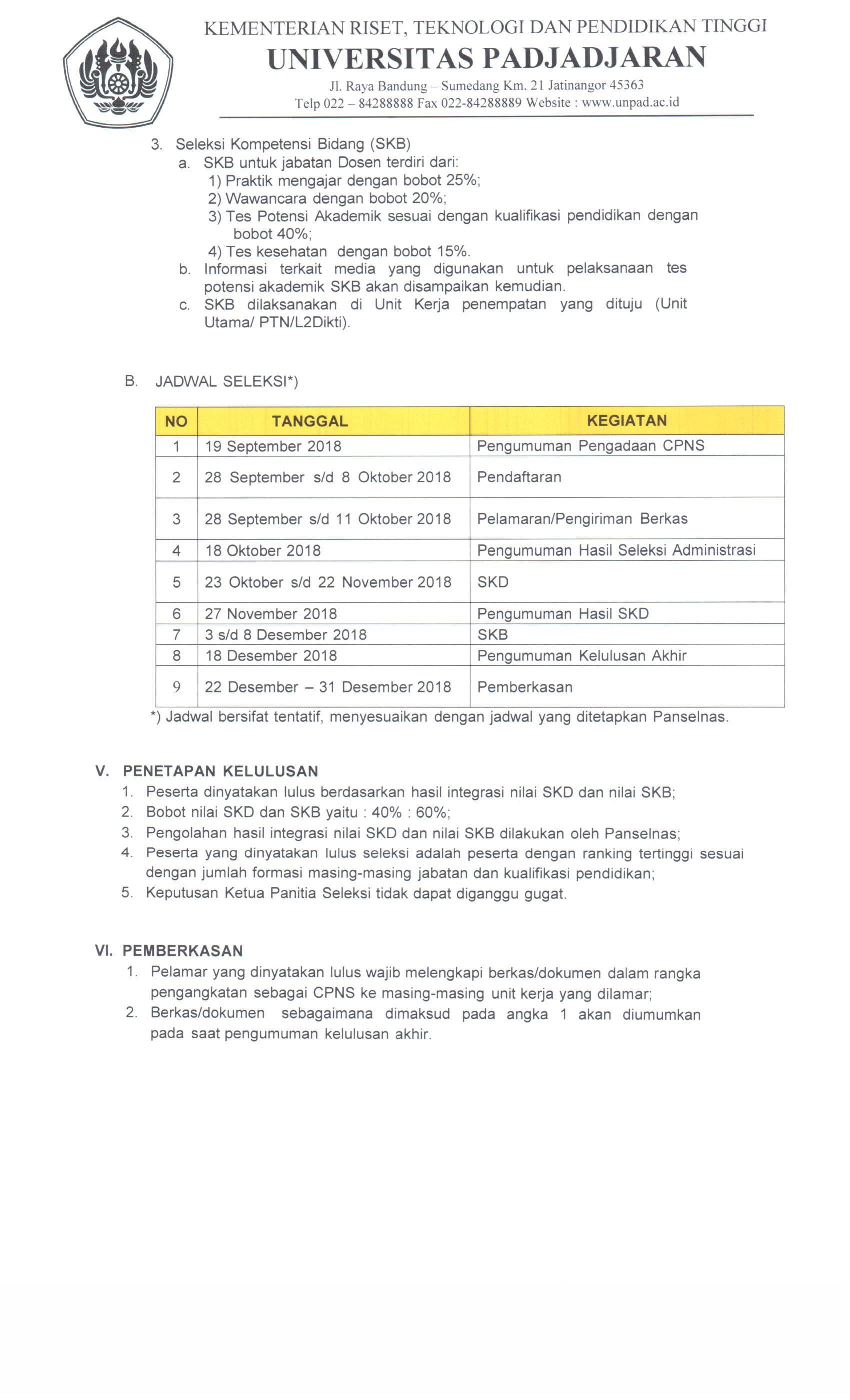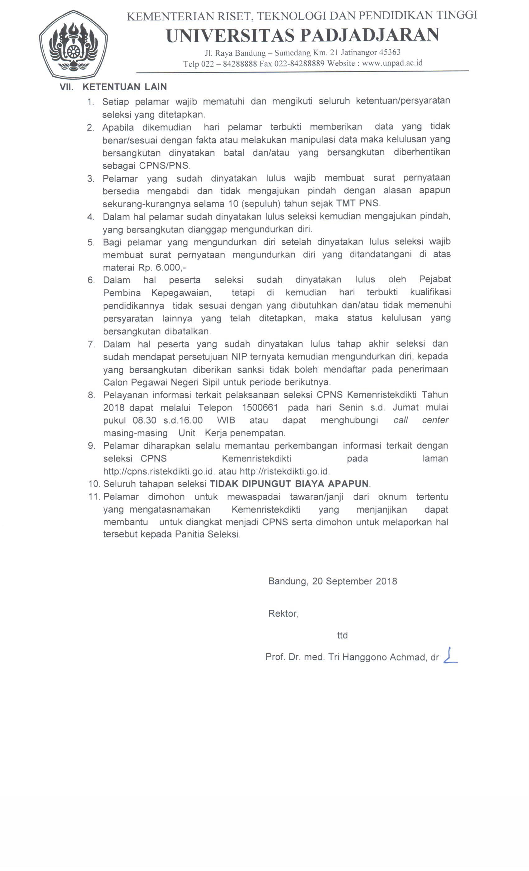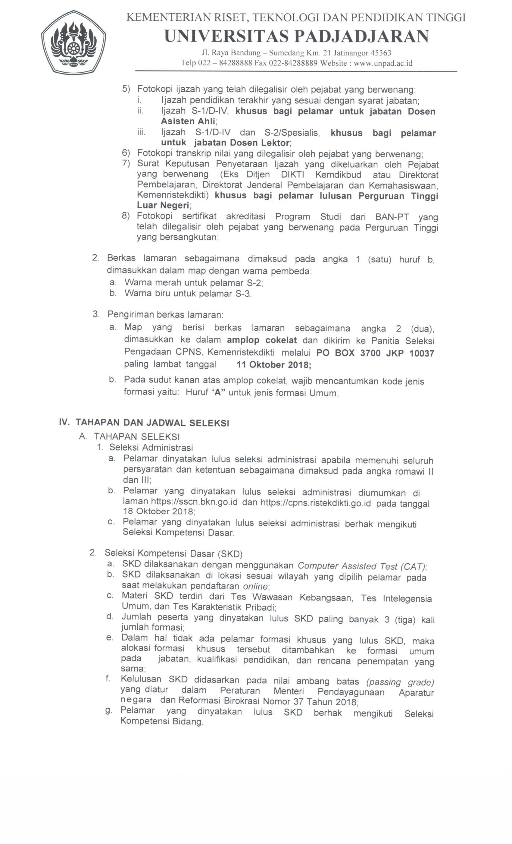 Pengumuman Pengumuman Seleksi Penerimaan Calon Pegawai Negeri Sipil (CPNS) Universitas Padjadjaran Tahun 2018 Kantor Komunikasi Publik 2018-09-24 1 min read 2018-09-24 Share this: Baca 1 menit Persyaratan Umum Alokasi Penerimaan CPNS Unpad (klik untuk memperbesar) 1291 views Share this: