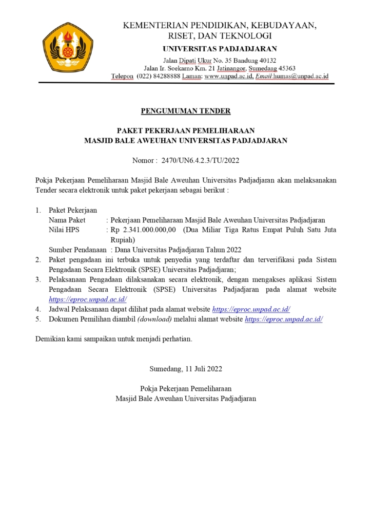 Pengumuman Pengumuman Tender Paket Pekerjaan Pemeliharaan Masjid Bale Aweuhan Unpad Kantor Komunikasi Publik 2022-07-11 1 min read 2022-07-11 Share this: Baca 1 menit 799 views Share this: