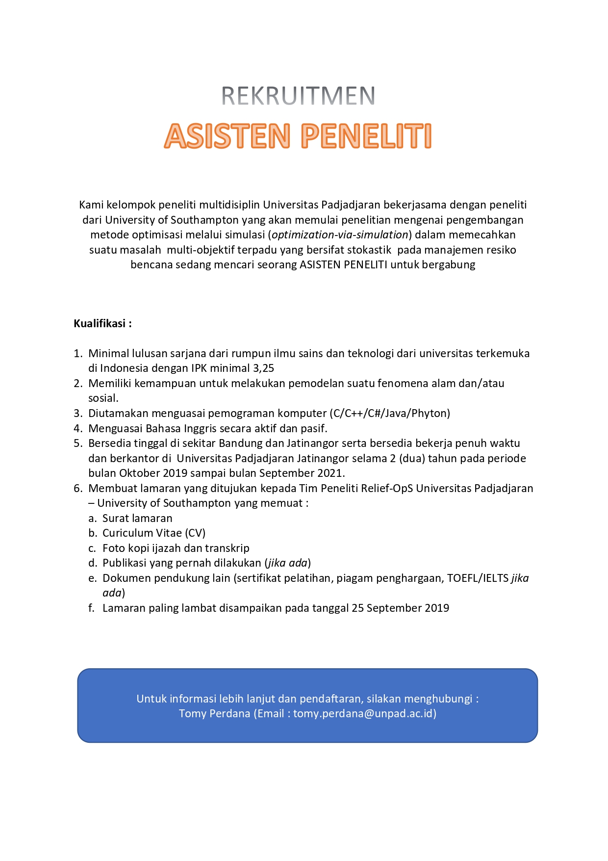 Pengumuman Rekrutmen Asisten Peneliti Kantor Komunikasi Publik 2019-09-11 1 min read 2019-09-11 Share this: Baca 1 menit 1374 views Share this: