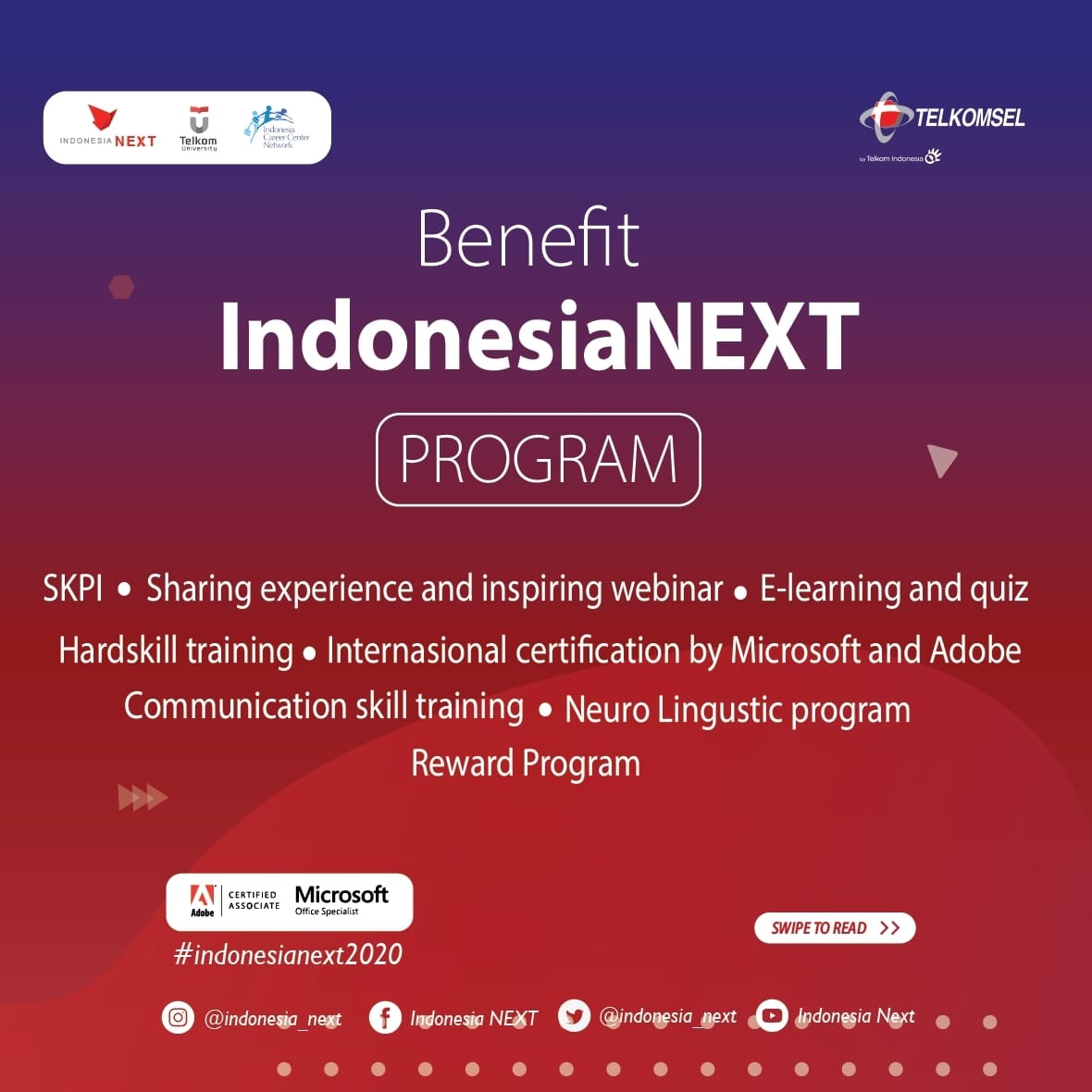 Dapatkan benefit program IndonesiaNEXT 2020 dan Pastikan NEXT people follow medsos Indonesianext agar dapat mengikuti terus keseruan progran IndonesiaNEXT
