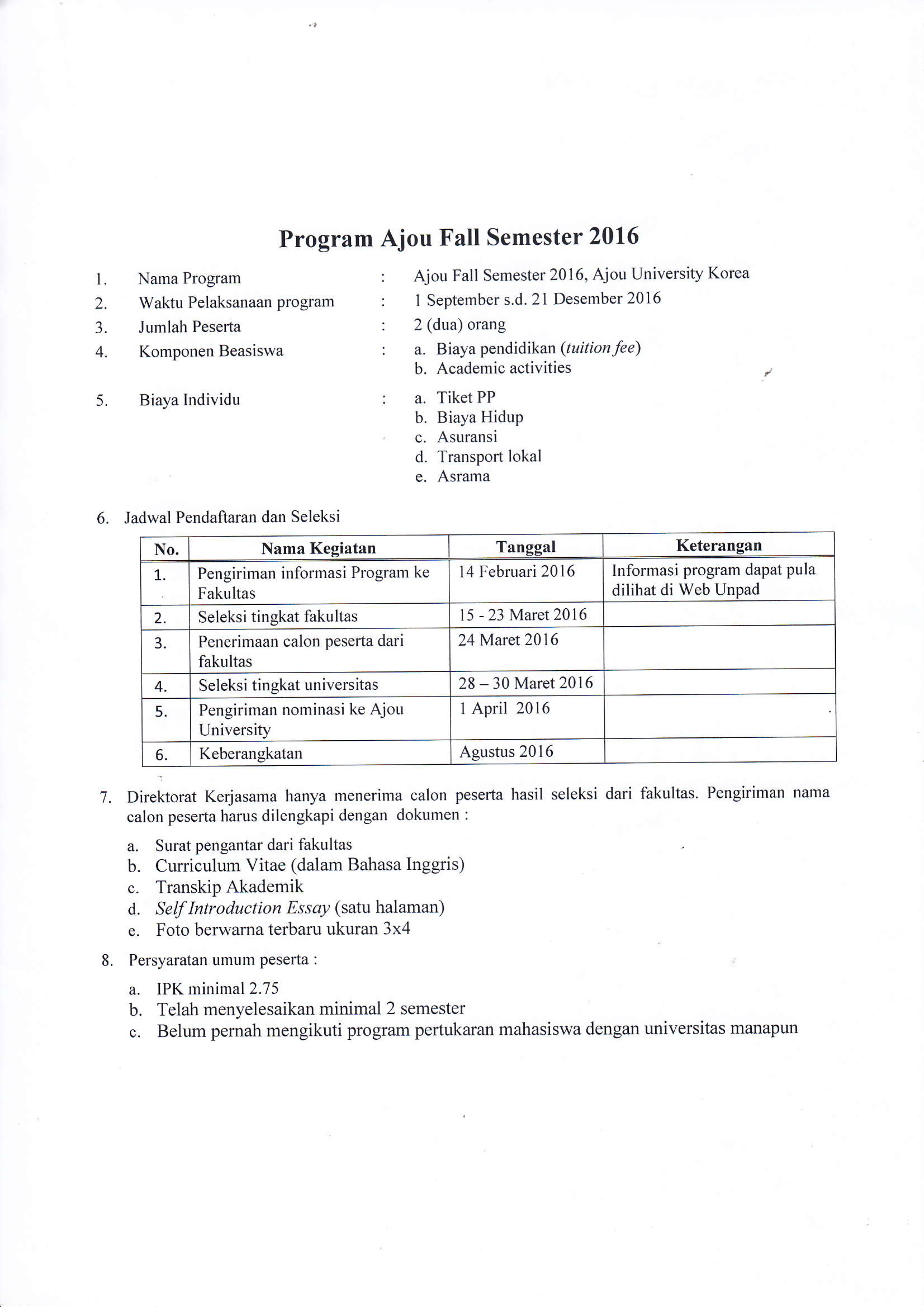 Pengumuman Seleksi Mahasiswa Calon Peserta Program Ajou Fall Semester 2016 Kantor Komunikasi Publik 2016-03-14 1 min read 2016-03-14 Share this: Baca 1 menit 250 views Share this: