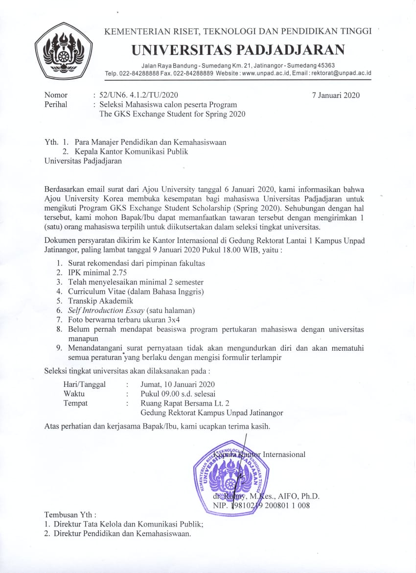 Pengumuman Seleksi Mahasiswa Calon Peserta Program The GKS Exchange Student for Spring 2020 Krisna Eka Pratama 2020-01-07 1 min read 2020-01-07 Share this: Baca 1 menit 529 views Share this: