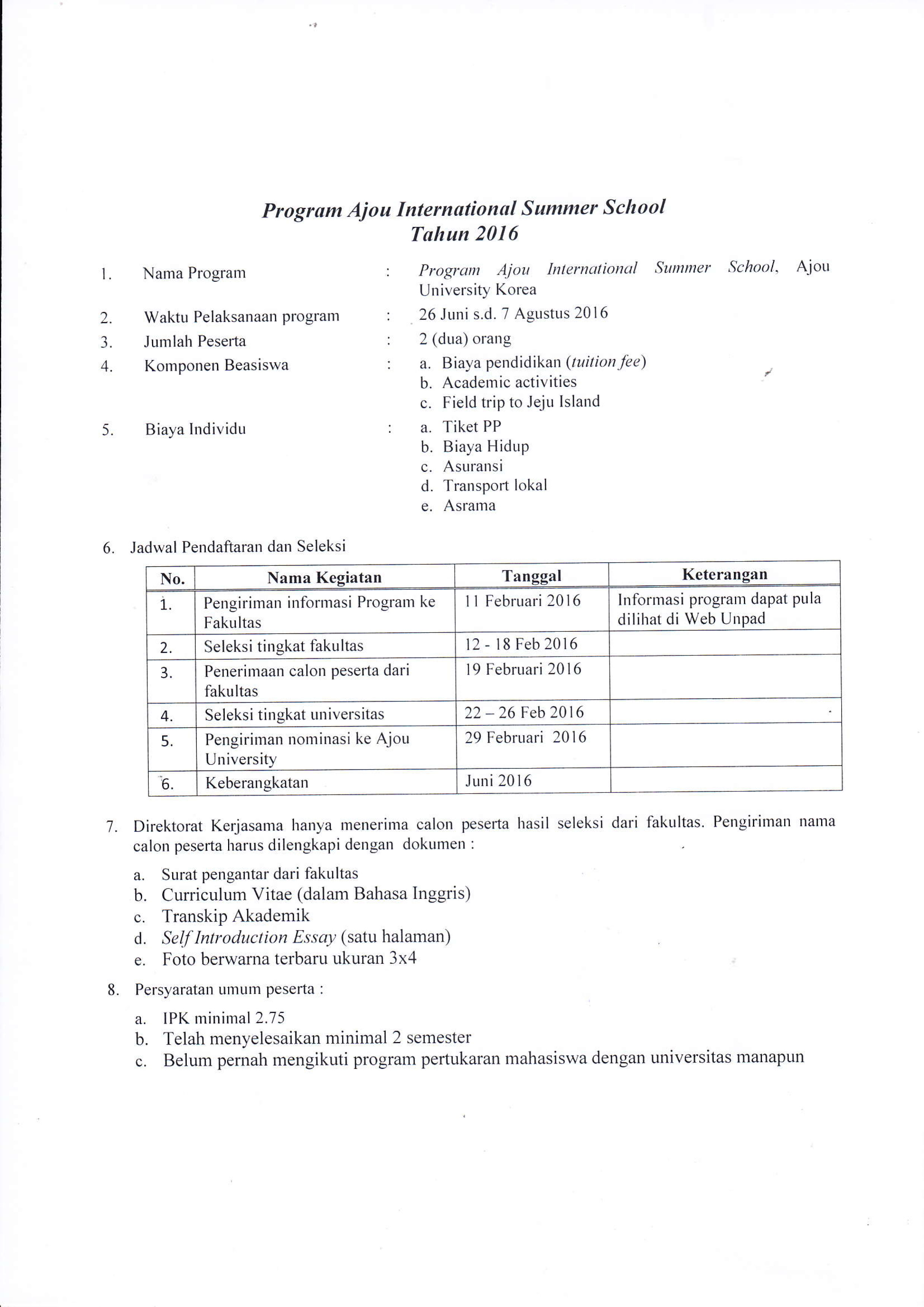 Pengumuman Seleksi Program Ajou International Summer School 2016 Kantor Komunikasi Publik 2016-02-11 1 min read 2016-02-11 Share this: Baca 1 menit 697 views Share this: