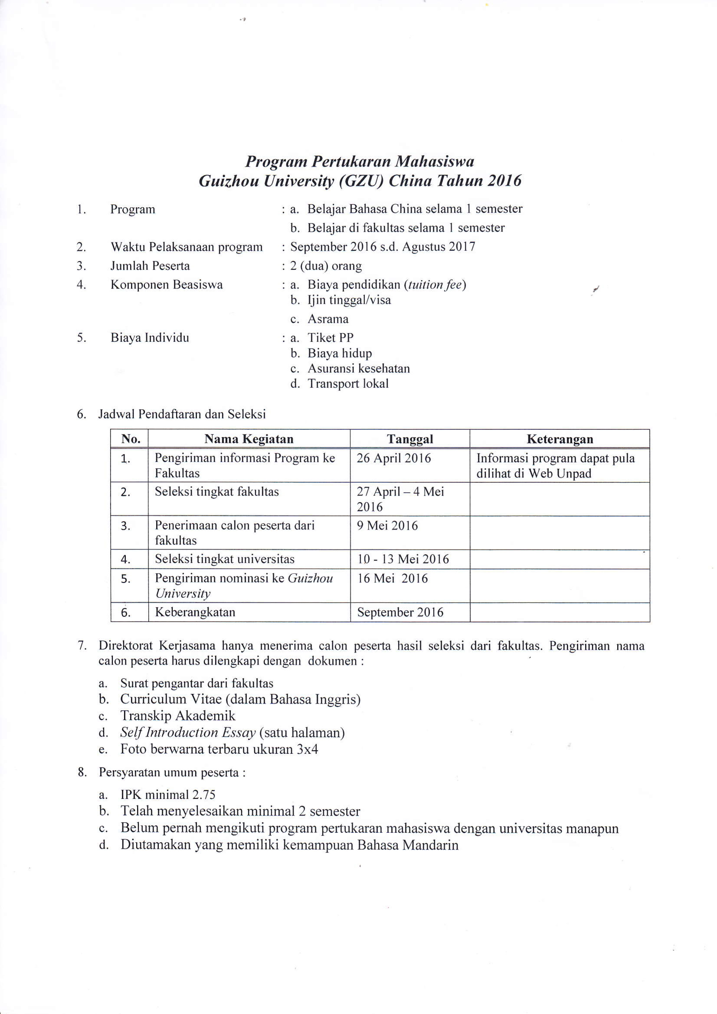 Pengumuman Seleksi Program Pertukaran Mahasiswa dengan Guizhou University China Kantor Komunikasi Publik 2016-04-25 1 min read 2016-04-25 Share this: Baca 1 menit 989 views Share this: