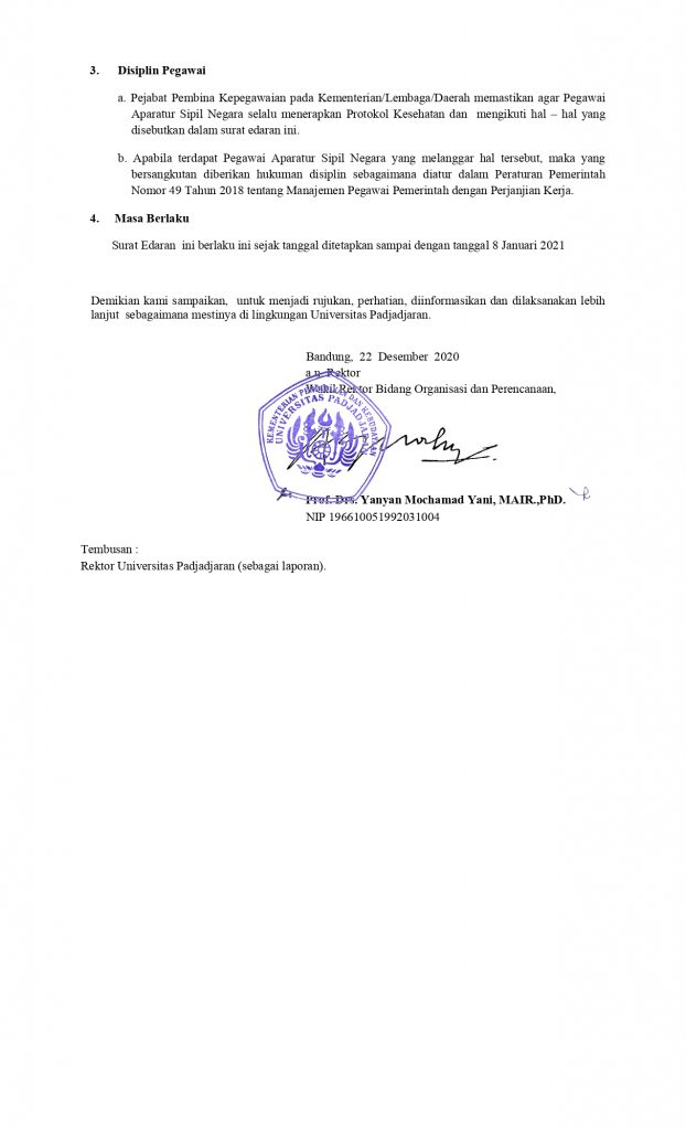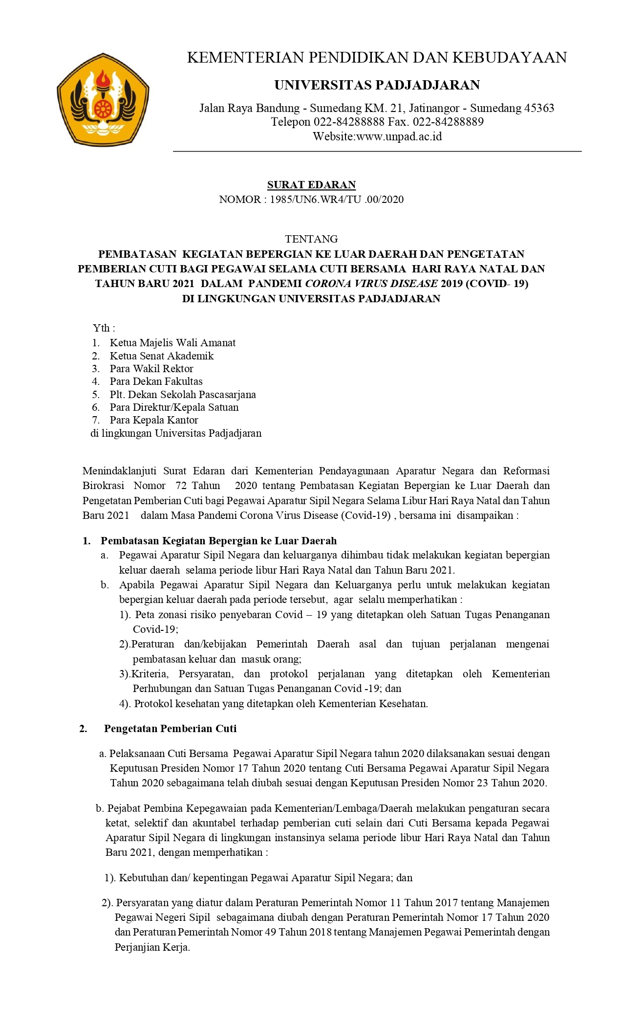 Pengumuman Surat Edaran Pembatasan Kegiatan Bepergian ke Luar Daerah dan Pengetatan Pemberian Cuti bagi Pegawai Selama Cuti Bersama Hari Raya Natal dan Tahun Baru 2021 dalam Pandemi Covid- 19 di Lingkungan Universitas Padjadjaran. Kantor Komunikasi Publik 2020-12-22 1 min read 2020-12-22 Share this: Baca 1 menit 1185 views Share this: