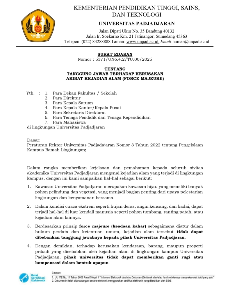 Pengumuman Tanggung Jawab Terhadap Kerusakan Akibat Kejadian Alam (Force Majeure) Erman 2025-10-15 1 min read 2025-10-15 Share this: Baca 1 menit 2046 views Share this: