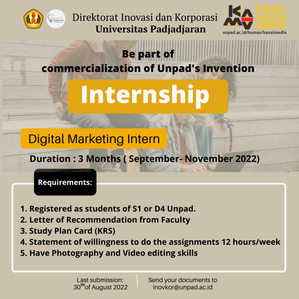 Pengumuman Tawaran Program Internship di Direktorat Inovasi dan Korporasi Unpad Kantor Komunikasi Publik 2022-08-25 1 min read 2022-08-25 Share this: Baca 1 menit 1016 views Share this: