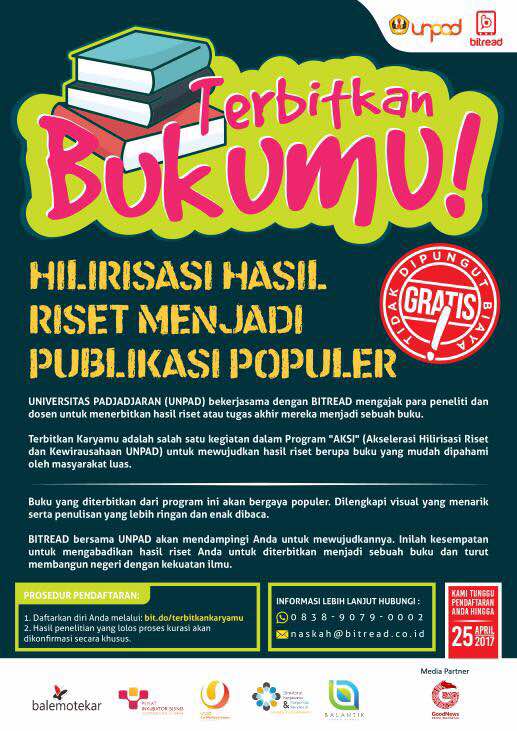Pengumuman Terbitkan Bukumu : Hilirisasi Hasil Riset menjadi Publikasi Populer Kantor Komunikasi Publik 2017-04-19 1 min read 2017-04-19 Share this: Baca 1 menit 321 views Share this: