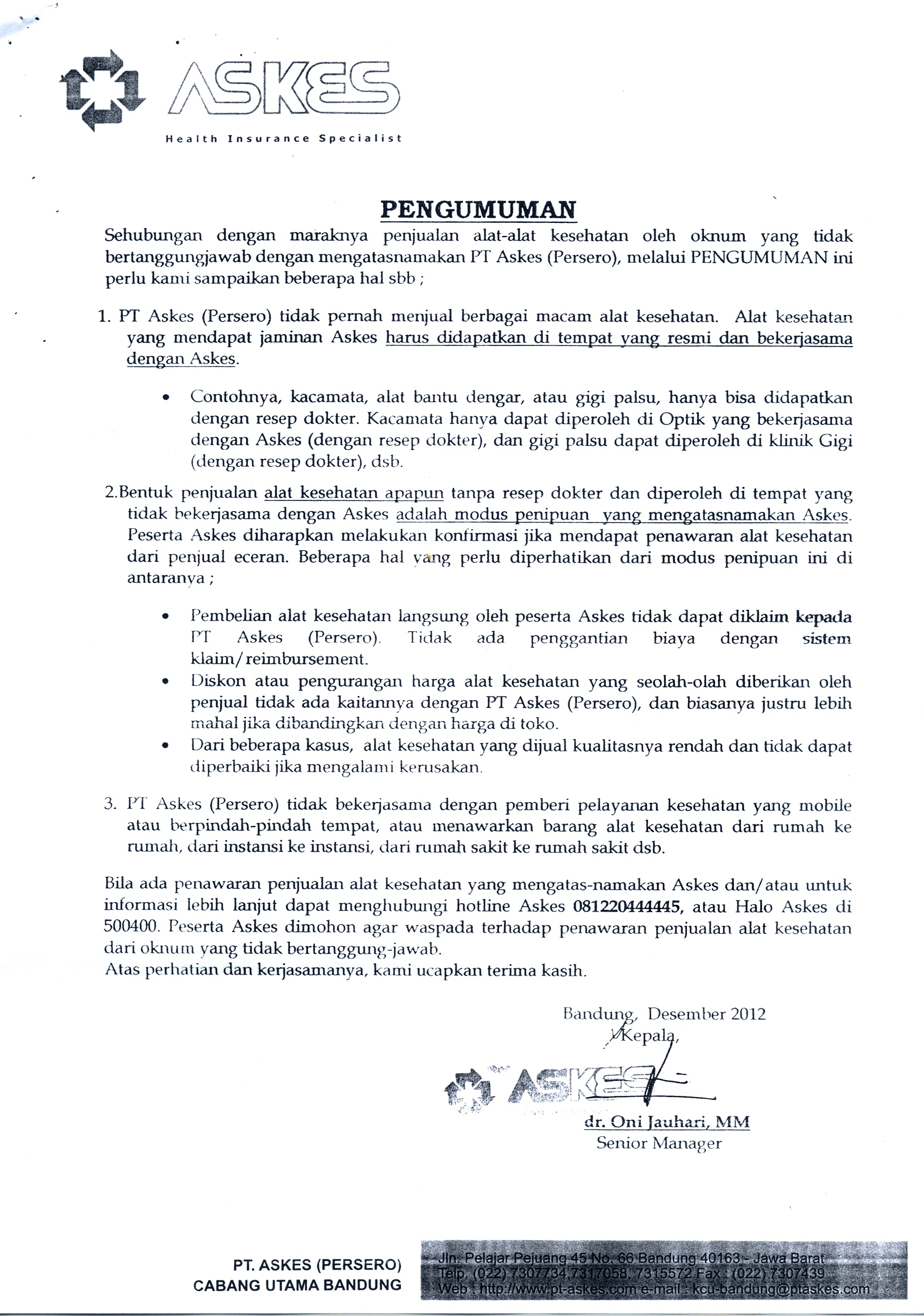Pengumuman Waspada, Penipuan Penjualan Alat Kesehatan Mengatasnamakan PT Askes (Persero) Kantor Komunikasi Publik 2013-03-14 1 min read 2013-03-14 Share this: Baca 1 menit 1469 views Share this: